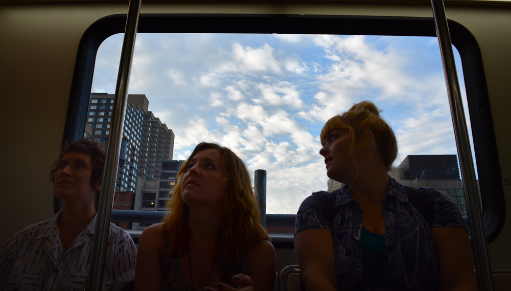 Our band had converged on the Michigan Avenue station, arriving on foot or locking bikes. Meanwhile, one stop further town the line I was waiting, on the platform at Times Square, and I hopped on board at the sight of friends, and some new faces. The automated Detroit People Mover shifted through its gears and accelerated away from the station in all of its 1986 style. We had come on an aimless commute in a downtown that, despite a recent spike in commercial and residential development, still mostly closes down after five o’clock: Bridget, Lauren, Caitlin, Rachel, Eva, Jule, and myself.