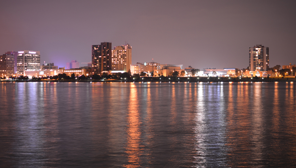 We converged among indoor palm trees and a dramatic view of the Detroit River. Outside into the still-warm air and to the handrail at the water’s edge, looking out just as the as the full moon rose, big and orange, across the water and over Canada. Behind us, glass-walled elevators receded upwards, each marked by a ring of incandescent light bulbs at its base.
