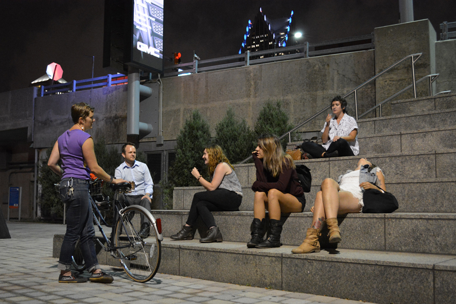 Meg was reading a book from her perch atop a long ledge of sittable space. We sat with her, noting that places to sit, un-bothered, at night—especially spots with enough light by which to read a book—were much too rare in Detroit, and probably in most other cites as well. Someone had the idea that we would make a map. Caitlin and Lauren said goodbye and walked north.